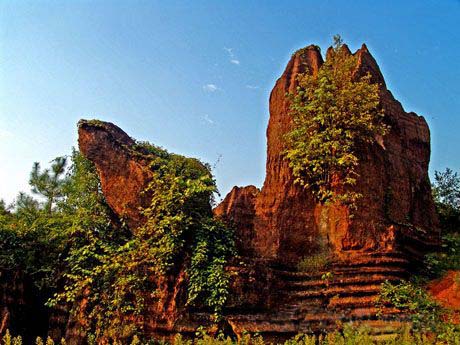 紅石林位于茄通和斷龍山鄉境內,方圓上萬公頃,精華景觀達數百公頃。那遍布的紅彩奇石造型各異,姿態萬千,或依山而立,或拔地而起,古樸秀雅,氣勢宏偉,身臨其境,恍如仙境。一尊高 12.6米的擎天石柱,猶如一東方巨人,指點江山;巨石對面,另一石則婀娜多姿,秀麗動人。另有一山頭遍布紅石,或高或低,或長或短,游人入此,頓覺撲朔迷離,難覓來路。入另一處石林,但見如墻似垣,高度不大,但排列組合得與樓蘭古城布局相差無幾。這里所有的石頭都披著一層細密的皺褶,如珊瑚礁一般,讓人想起幾萬年前這里是一片浩闊的大海,海浪時時轟鳴著一波波沖擊著礁石。