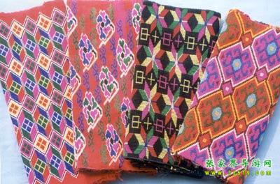 ![]() 織錦。又名“西蘭卡普”、“土花鋪蓋”,為土家族傳統工藝品之一,是森林公園工藝品廠的主要產品??楀\是在特制的本質織機上以錦紗為經、五彩絲線為緯、手工提花織成。以其質地厚實、堅韌,色彩鮮艷,格調古樸,流暢生動著稱。圖案有花草、鳥獸、生產、生活、幾何、字樣等種類。為舊時土家姑娘必備嫁妝之一。據考證,早在漢代,土家織錦就作為方物貢入漢室宮廷。20世紀后,土家織錦曾漂洋過海至日、美、英等國展出,并作為禮品,被國家領導人贈送給外國元首及政府官員,如今織錦以壁掛、枕巾、沙發墊、桌圍、提袋、服飾等多種式樣遠銷世界各地。