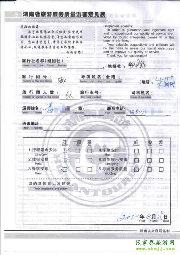 2010年8月15日岳陽李先生一行六位旅游質量反饋