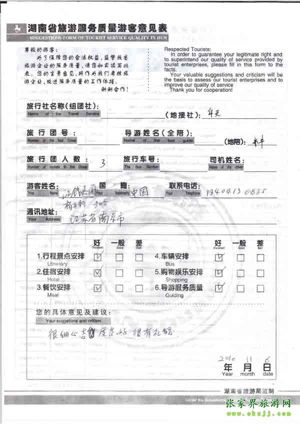 2010年11月6日江蘇楊小姐一行3位旅游質量反饋:很細心,態度好,很有禮貌