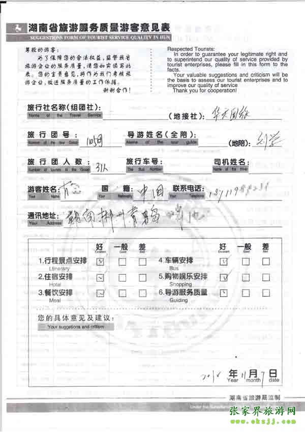 2010年11月7日郴州肖先生一行31位旅游質量反饋