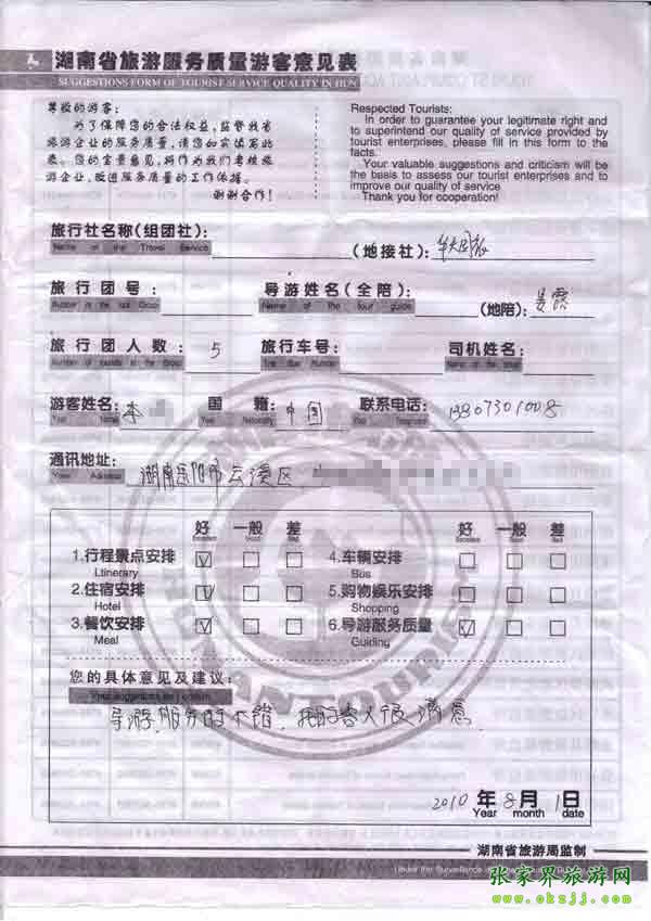 2010年8月1日岳陽李小姐一行5位旅游質量反饋