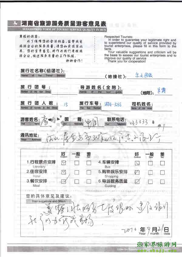 2010年9月21日河北李先生一行15位旅游質量反饋:服務很好
