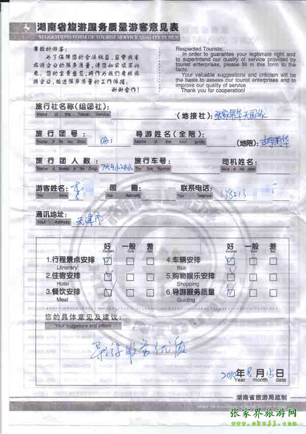 2010年8月15日天津李胡先生一行13位旅游質量反饋:導游服務優質