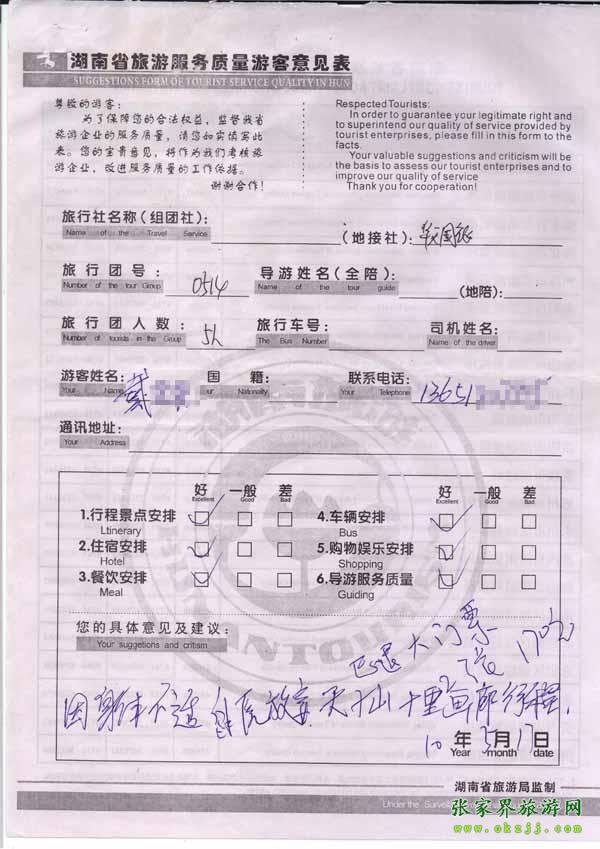 2010年5月17日戴先生一行5位旅游質量反饋