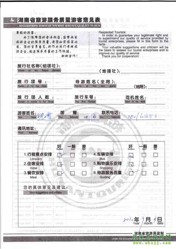 2010年9月9日沈小姐旅游質量反饋