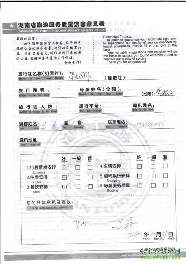 2010年10月31號艾先生旅游質量反饋:好!