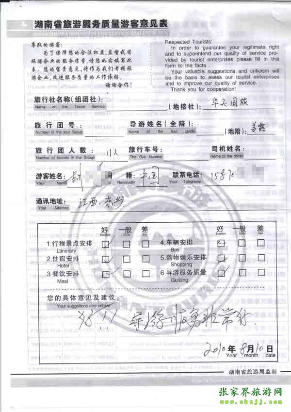 2010年8月10日江西胡先生一行11位旅游質量反饋
