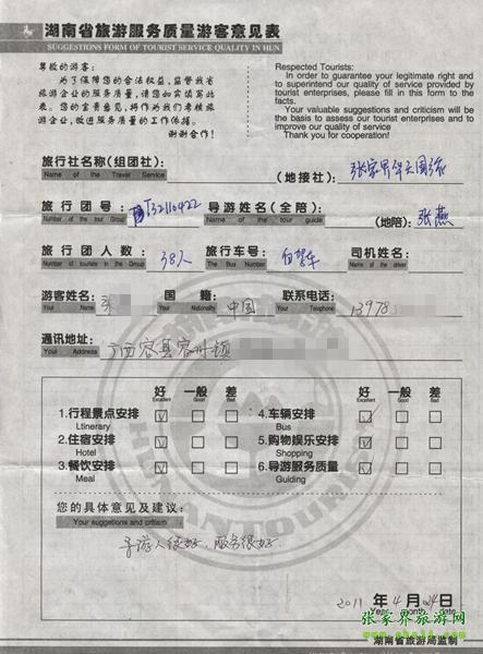 2011年4月24日梁小姐一行38人旅游質量反饋:導游人很好,服務很好