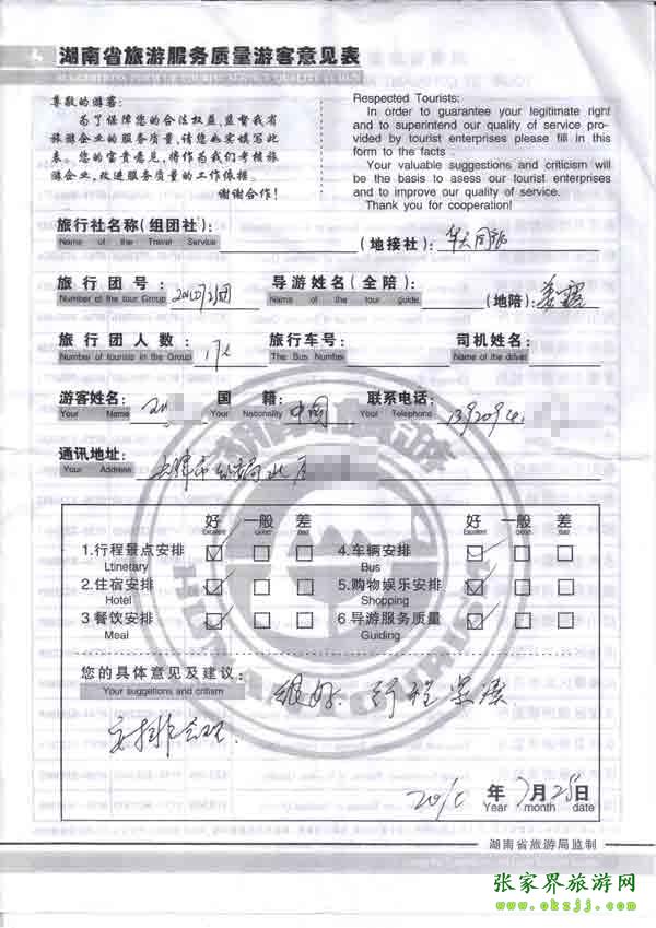 2010年7月29日天津王先生一行17位旅游質量反饋